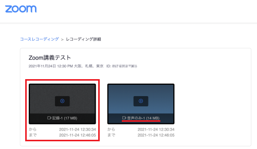 録画-1(長時間の場合は録画-2などいくつかに分かれている場合があります)をクリックします。もし、音声のみを聞きたい場合は、「音声のみ」も選択できます。